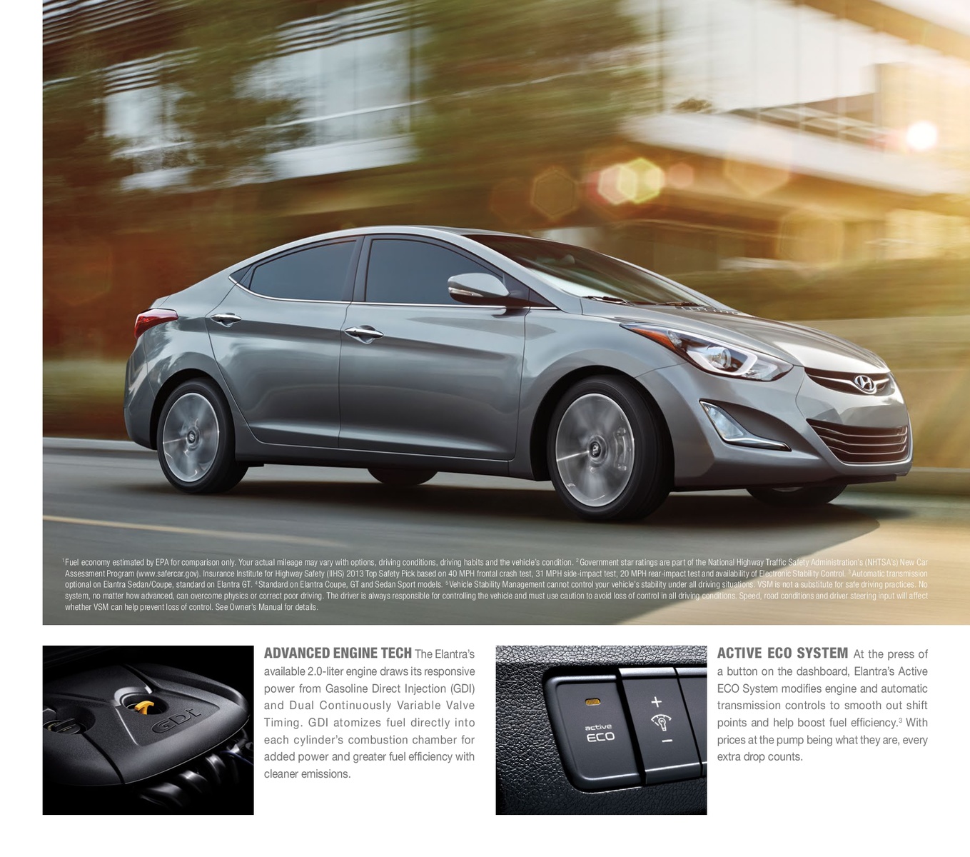 Active eco hyundai elantra 2013. Front wheel drive and a six speed manual transmission are standard. Learn how it drives and what features set the 2013 hyundai elantra apart from its rivals. Active eco engaged by a dashboard switch to the left of the steering wheel modifies engine operation so you get more gradual acceleration and the transmission tends to shift to higher gears sooner and isnt as quick to downshift for passing.